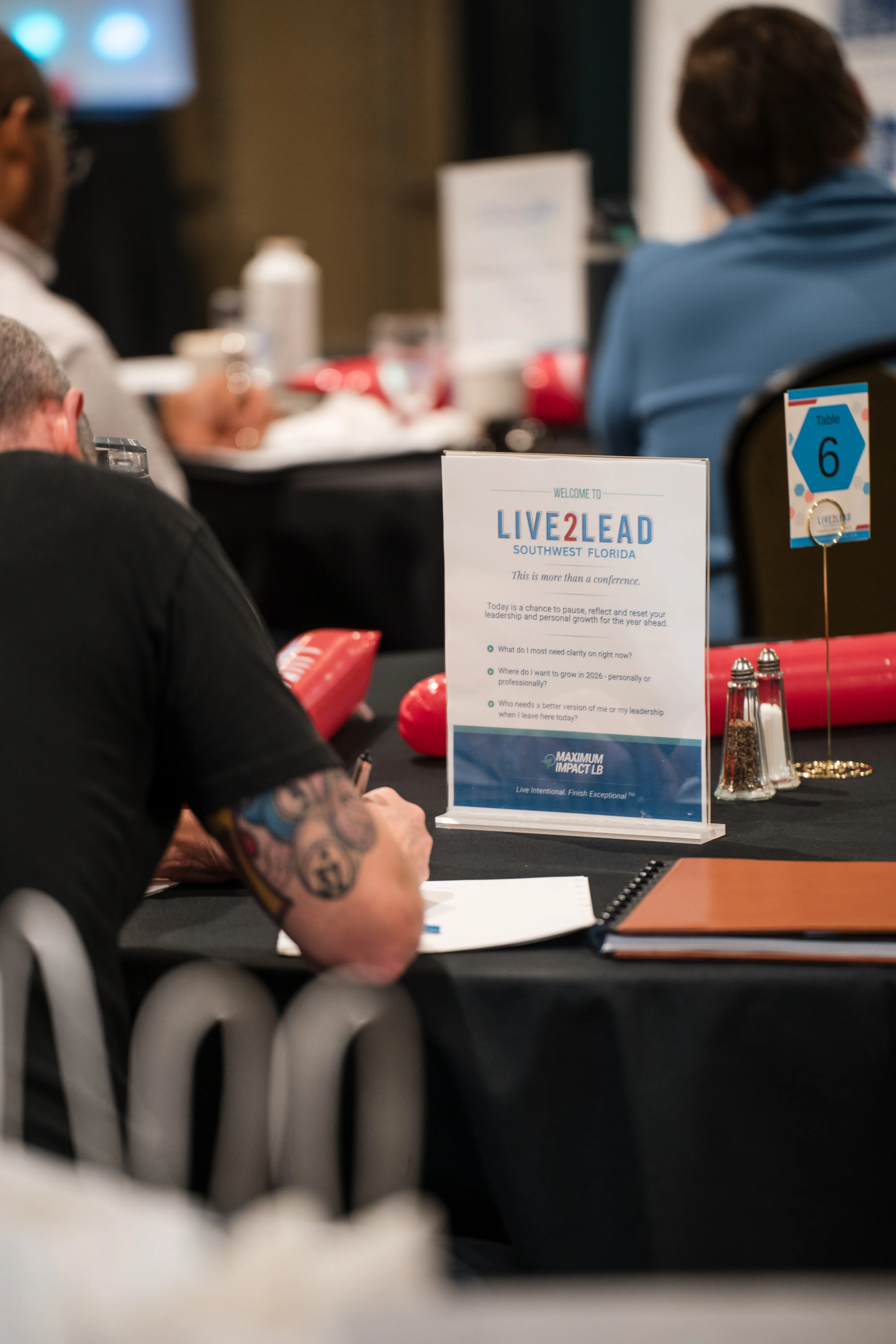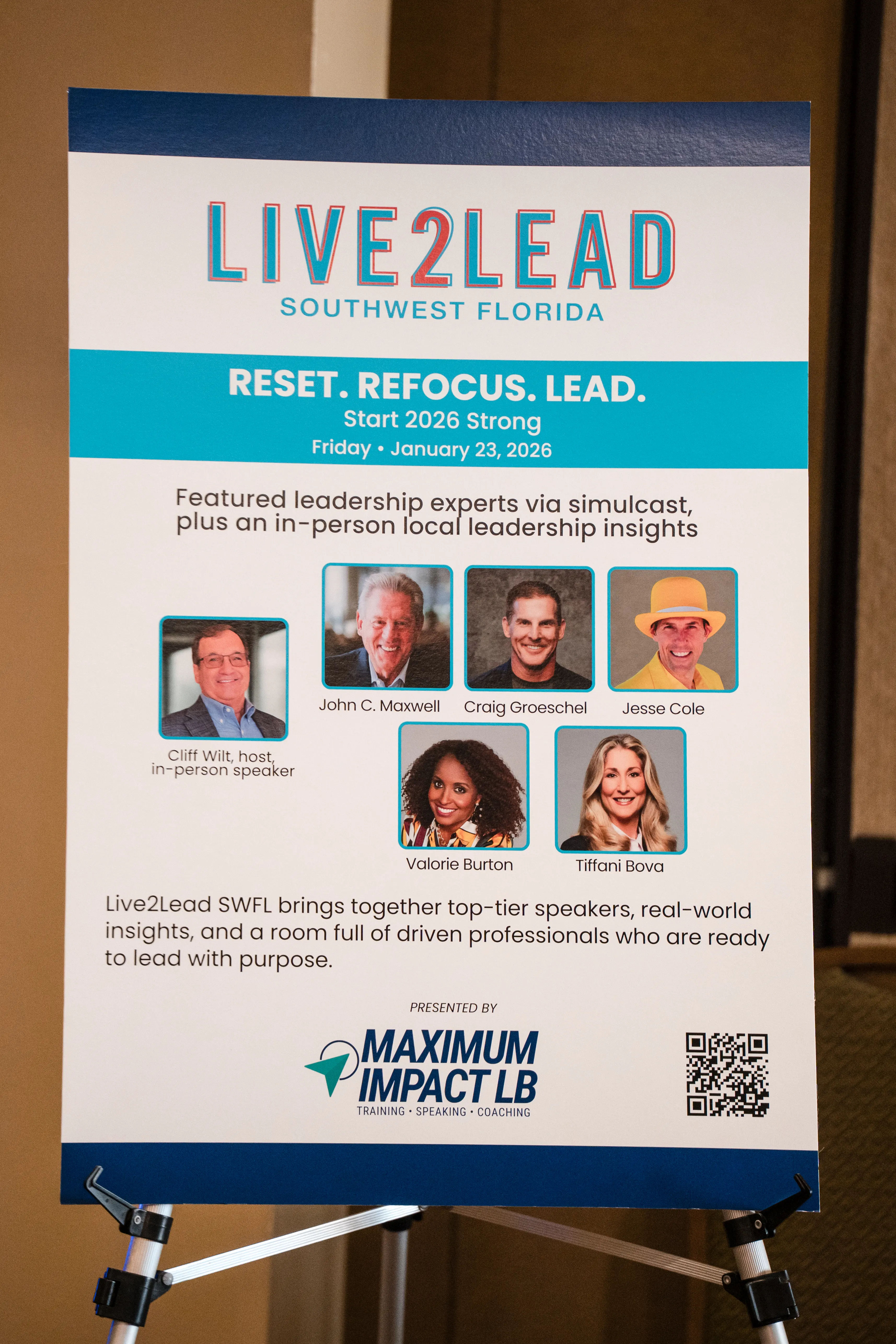 Our next Live2Lead Southwest Florida event is planned for January 2027. In addition to our annual Live2Lead experience, Maximum Impact Life & Business also partners with organizations and private groups throughout the year to deliver customized leadership development experiences.