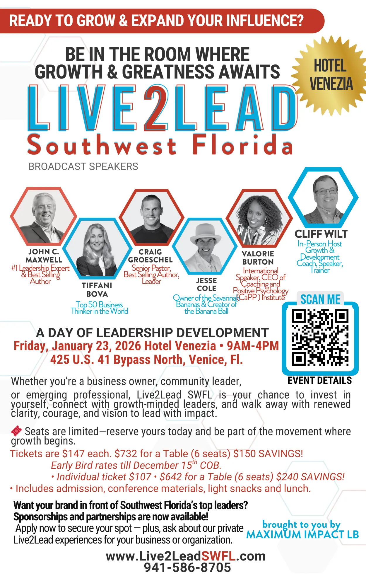 If you're a leader or influencer seeking to level up your impact, Live2Lead is the event for you! It's tailor-made for leaders across all sectors, from community leaders to college students, small business owners, CEOs, teachers, pastors, and more. Don't miss this opportunity to sharpen your skills and connect with fellow leaders!